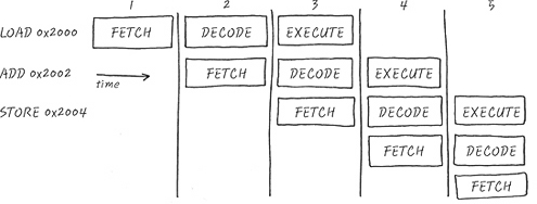뭐 이런 식인 거에요. 세 개의 Instruction의 각 stage (fetch, decode, execution)를 한방에 처리할 수 있는 게지요. 현재 이 순간 STORE 0x2004를 메모리에서 가져오고 있고요, ADD 0x2002가 무신 명령어인지 Decode하고 있고요, 실제로 실행은 LOAD 0x2000을 하고 있는 거죠. 으랏차.
