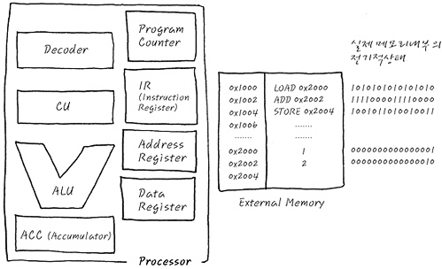 일반적인 CPU의 동작 예를 들기 위하여, 조금 더 Simplified된 CPU모델을 소개하고자 합니다. CPU는 최소한의 동작을 위하여 그림과 같이 , CU, ALU 이외에도 Program Counter, IR, Address Register, Data Register, ACC 등을 포함하고 있는 게 일반 적인 구조지요. 뭐 하나 하는데도 이렇게 많은 것들이 필요한가 싶은데, 뭐 일단은 두뇌나 다름없는 부분이니까, 이정도 복잡하다고 해서 그렇게 놀라서는 안됩니다. 태연자약하게 봐주세요. 뭐, 어떻게 보면 Decoder나 CU, ALU등은 앞의 논리회로로의 확장에서 보신, Transistor로 가득 찬 Digital 회로인데, 그것까지 다 보려면 머리가 아파질 것 같아서, 이 정도로만 하는 것입니다. - 사실 저도 머리가 아파서 이 정도로 그만 한다고 생각하니 어지러운 머리 속이 조금은 평화로워진 것 같기도 합니다. - 그림의 왼쪽부분은 그야말로 Processor (CPU) 부분이고, 오른쪽은 외부에 달려 있으며, 프로그램과 데이터를 담고 있는 External memory (RAM 또는 NOR flash따위의 ROM)를 의미합니다.