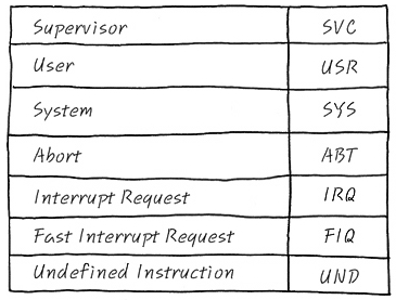 이 상황에서 ARM core는 7가지 동작 Mode를 사용한다는데 설명을 잘 읽어 보고도, 감이 잘 안 오지요. 의문의 연속입니다. 뭔 Mode가 이렇게 많아. 어쨌거나, 저쨌거나 Mode가 많으니까 참으로 난감하기 짝이 없는 거죠.일단은 mode는 다음과 같이 3글자 약자로 많이 쓰니까 그거 익혀 두세요. 뭐 다 쓰기 귀찮아서 그렇기도 하고 3글자로 통일하면 뭐 있어 보이잖아요?