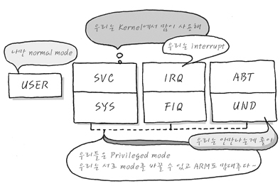 그것은 예를 들어, SYS ↔ FIQ, IRQ ↔ SVC과 같이 Privileged Mode → Normal Mode (USR)은 가능하지만, USR → Privileged Mode로의 변경은 불가능합니다. 아주 중요한 사실입니다. 기억해 주세요