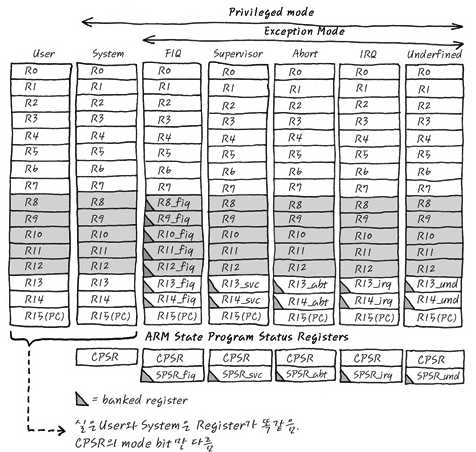 그러니까, CPSR의 값은 현재의 mode도 확인 가능한 register 인거죠. 실은 CPSR의 하위 5bit를 원하는 mode로 setting하면 그 mode로 전환도 됩니다. System mode와 User mode는 이 CPSR의 mode bit만 차이가 나고 나머지 Register는 모두 같이 사용합니다. 마치 부부처럼 한 몸입니다. *^^* 부끄.