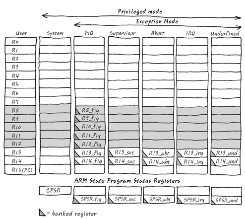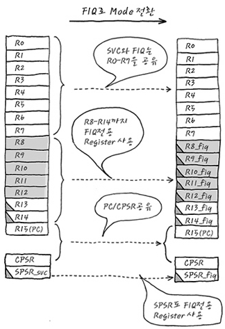 뭐 예를 들면 다음처럼 들 수 있겠네요. SVC mode로 돌다가 Fast Interrupt가 걸려서 FIQ mode로 진입했을 경우의 Register상태는