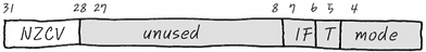 5번째 T 는 Thumb mode이냐, ARM mode이냐를 나타내는 field로서, ARM/ Thumb mode는 ARM Thumb mode section에서 자세히 다루니까 너무 급하게 생각 안하셔도 돼요.