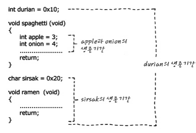 보통 Local, Global variable이라고들 부르는 용어가 있는데, 이는 변수의 scope와 생존기간을 모두 포함한다고 하여, 별로 좋아하지 않는 사람들도 있습니다만, 이 변수의 구분이 상당히 reasonable하면서도 간단하여, 저는 상당히 선호하는 편이에요. 이제부터 scope = 생존기간이라고 생각하셔도 무방 합니다요.