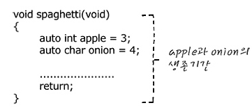 이런 모양의 함수라면, 그림에서 볼 수 있듯이, apple과 onion의 생존기간은 두 변수를 선언한 spaghetti()가 그 흥망성쇠를 다함과 동시에 automatically 삼천 궁녀처럼 사라진다고 볼 수 있겠지요. 그러니까, 이 함수 이외의 다른 곳에서는 갑자기 혜성처럼 나타나 건드릴 수 없습니다.