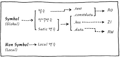 자, 여기저기 보면 흘러나오는 용어들 중에 .data, .bss, .constdata, .text등을 다시 한번 구분해 보겠습니다. 얘네들은 RW, ZI, RO로 차례차례 Mapping될 수 있고요. Unix쪽에서 사용하는 용어에요. RW = .data, ZI = .bss, RO = .constdata + .text 로 말이죠. 이런 것들은 모두 Symbol (Global)들만이 그 구분을 가질 수 있죠. 뭐, 쉽게 말해서. .data는 초기값이 있는 전역변수, .bss는 초기값이 없는, 또는 Zero인 전역변수, .constdata는 const로 선언된 전역변수, text는 함수 등의 code가 자리잡을 수 있습니다.
