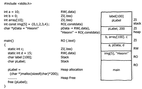 오, 여기에서 한가지 더 나아가자면, ADS등에서는 RW, ZI, RO 세가지 형태의 구분도 있을 수 있는데, 이런 구분은 어떻게 나뉠까 한번 생각해 보시지요. RW는 read-write 로서, 초기값이 있는 전역변수를 의미하고, ZI는 Zero-initialized로서, 초기값이 0인 전역변수를 의미하고, 마지막으로 RO는 Read only로서 수정이 불가능한 const 전역변수와 text인 code를 의미합니다. 한가지만 더 comment하자면 전역변수 중에서도 RO로 분류되는 변수가 있는데, 그 녀석들은 const로 선언된 data들이에요. 후후. const는 Read Only 변수니까요.