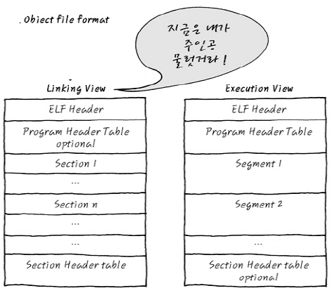 이런 식으로 따져 가다 보면, - ELF specification을 전부다 분석하다가 진짜로 무엇을 하려고 했는지, 잊어버릴 수도 있으니까, 실제 분석은 ELF specification을 보시는 것이 도움이 되겠습니다. 덜덜덜 - 실제적인 ELF의 형식을 다음 그림과 같이 표현할 수 있겠습니다.