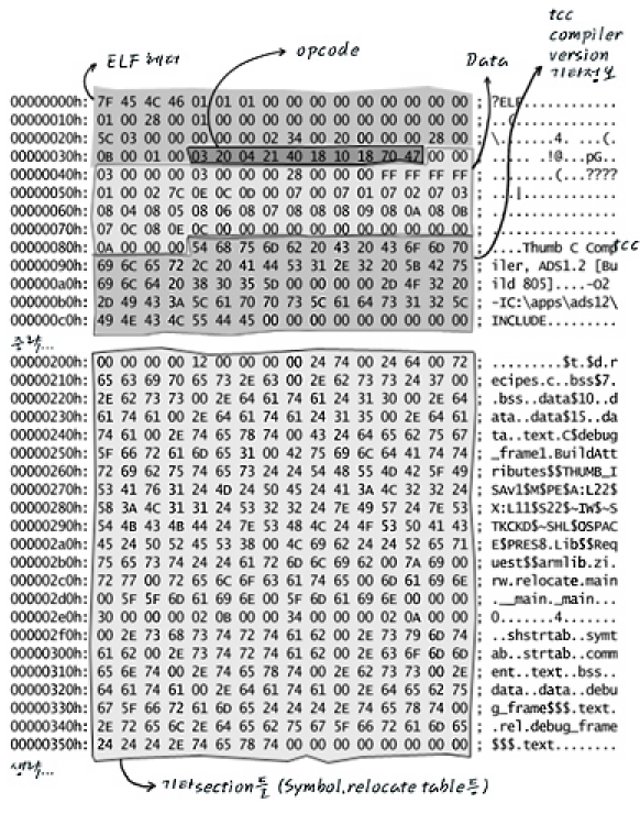 음.................................... 음.. 상당히 뭔가 있어 보입니다만, 머리 속이 복잡해 지는군요. 인간의 눈으로는 모르는 것이 당연합니다. 이제부터는 기계어 세상이 되어 버렸으니까요. (ELF 규격을 따른) 이 숫자들의 연속인 것을 알아보려면, 앞에서 말한 ELF format에 대하여, 조금 알아야 합니다.