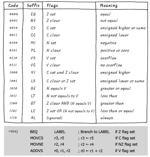 한번 슬쩍 둘러봐 보세요. 무슨 차이가 느껴지지 않습니까? 1. ARM mode가 Thumb mode보다 1줄 짧다. 일단 ARM mode가 Thumb mode보다 날씬~ 압축된 느낌 아닌가요? ARM은 12 line, Thumb은 13line으로 구성되어 있습니다. 2. 뭔가 비교하는 게 틀리다. Thumb은 조건을 CMP로 비교 후, 그 결과를 가지고 뭔가를 판단하는데 비해 ARM은 앞의 산술 결과를 계속 이용할 수 있으며 모든 명령어가 조건부 실행이 가능하게 구성되어 있어요. 3. Stack 명령어가 다르다. ARM은 Multiple Register Transfer 명령어로 되어 있는 반면 Thumb은 PUSH와 POP으로 이루어져 있습니다. 앞의 3가지가 가장 큰 다른 점이라고 보겠습니다. 1번의 경우에는 그럴 수도 있고 아닐 수도 있는데 대부분 ARM mode로 구현된 경우가 Thumb mode로 구현된 것 보다 instruction 개수는 더 적습니다. 왜냐하면 ARM mode는 항상 조건부 실행이 가능하기 때문이죠. 뭐 이유로는 분기명령의 사용을 줄여 Pipe line에서 cancel 되는 횟수를 줄여 CPU가 노는 낭비를 줄일 수가 있지요. 그러다 보니 비교하는 방법이 틀려지는 게 당연한 거죠. ARM 명령어에서는 명령어가 하나 실행 될 때 CPSR의 [31:28]의 4bit를 조건이 걸려 있으면 조건 확인이 가능하고 그 조건에 따라 명령의 실행 여부를 결정할 수 있습니다. 만약 ARM 명령어에 조건이 걸려 있지 않으면 always라는 상태로서 조건에 상관없이 실행되도록 하지요. 앞에서 CPSR쯤에 이런 말을 한 적이 있습니다. " ARM core는 Opcode를 Memory에서 가져오자 마자 (Fetch) 이를 무조건 실행하는 것이 아니라 condition flag인 NZCV를 보고 바로 앞 opcode의 실행결과를 보고 실행할지 말지를 결정할 수 있어요. Default는 AL "Always", condition과 관계 없이 항상 실행 이긴 하지만요. "뭐 이 말이 여기에 어울리게 될 줄은 상상도 못했지요? ㅋ 그러니까 ARM 명령어는 조건부로 실행할 수 있지만 Thumb 명령어는 조건부 bit가 없으므로 무조건적으로 실행된다니까요. 여러 가지 많은 경우가 있지만, 가장 많이 쓰이는 몇 가지만 짚고 넘어 갈게요. CPSR의 flag를 보고 결정하지만, 보통 바로 앞의 연산 결과라는 게, 비교 즉, cmp하는 건데, CMPS r0, r1이라고 함은 r0-r1을 해서 그 결과를 보게 되는 거에요. 그 결과는 CPSR의 NZCV에 update되니까 그걸 참조하면 됩니다. (여기에서 S는 연산결과를 CPSR의 NZCV에 update해라라는 뜻이에요) 여기에서 대문자는 1, 소문자는 0으로 편리하게 포기 하겠습니다. Nz 하면 N=1, Z=0 이라는 뜻이에요. EQ 는 EQUAL 같으면, 즉 그러니까 결과가 0이면, ZNE 는 NOT EQUAL 다르면, 즉 그러니까 결과가 0이 아니면, zGE 는 Greater than or Equal 크거나 같으면, 즉 그러니까 결과가 양수이거나, 음수이면서 overflow가 나거나 NV or nvGT 는 Greater than 크면, 즉 그러니까 결과가 양수이거나, 음수이면서 overflow가 나고, 0이 아니면 NzV or nzvLE 는 Less Than or Equal 작거나 같으면, 즉 결과가 0이거나, 음수이거나, 양수이면서 overflow가 났거나. Z or Nv or nVLT 는 Less Than 작으면, 음수이거나, 양수이면서 ovefflow가 났거나. Nv or nV eg.) BGT : 앞의 결과가 크거나 같으면, Branch하고 아니면 말고. 이에요. 나머지 많은 것들은 아래 Table을 참고 하세요.