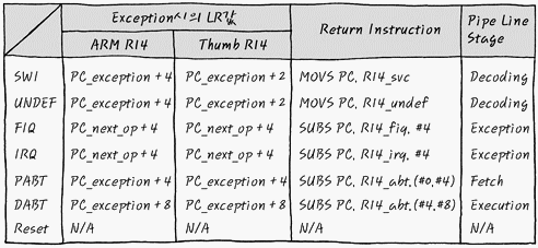 ARM mode인 경우에는 1 cycle이 4, Thumb Mode의 경우에는 1 cycle이 2 이니까요. 그런데 잘 보면 FIQ, IRQ, Prefetch Abort, Data Abort의 경우에는 ARM mode와 같고, SWI/ UNDEF의 경우에만 PC_exceptoin + 2로 되어 있죠. 실제로는 SWI, Undef의 경우에는 Fetch하면서 Decode 단계에서 Exception이 나는 것들이고요. 이 녀석들만 Thumb mode인 경우에 그에 맞추어 PC_exceptoin + 2 를 LR에 넣을 수 있도록 처리해 줍니다. 그렇게 하면 원래 상태로 돌아가기 쉽겠죠.