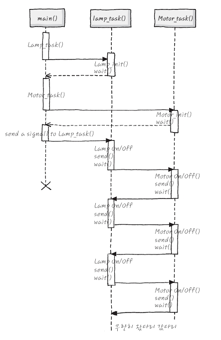 뭐 이렇게 이름 지을 수 있겠네요. Lamp Task는 무한히 깜빡이는 일을 하죠. 그러면, 또 다른 Motor를 돌리는 Motor Task도 같이 돌아야겠죠. 그러면 Lamp_task()와 Motor_task()가 서로 주거니 받거니 일을 했으면 좋겠는데 말이죠. 그래서 signal이라는 걸 만들어줘 보죠. 이건 Task끼리 signal을 주고 받을 수도 있고, 그걸로 서로 일을 시킬 수도 있는 거라 생각하시면 되요. wait(signal); 이라는 함수를 약속해 볼까요? wait (signal)은 signal을 기다린다는 의미이고요, signal을 기다리기만 해서는 안되겠죠. signal을 주는 일도 해야 하니까, send (task, signal) 이라는 함수를 약속해 보면, 어떤 task한테 signal을 주는 역할을 한다고 해보죠. 그러면, 위의 task를 이런 식으로 만들면 서로 주거니 받거니 될까요?
