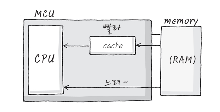 Cache라는 건 뭡니까? Cash가 드는 넘 이죠. 흐흐. Cache라는 건 교활한 놈이에요. 돈 잡아 먹는 기계죠. 왜냐! 느린 Memory와 빠른 CPU사이에 장난을 쳐서 마치 빠른 것처럼 만들어 주는 사기꾼인 거죠. 흔히들 System의 성능을 향상시키는데 Cache가 아주 중요한 역할을 한다고 말하는 데 도대체 무엇 때문에 중요하다고 하는지. 원래는 CPU와 Memory사이는 사실 속도가 느리죠. 쓰고 읽기가 느린 거에요. Wait State에서도 보았겠지만, CPU와 Memory의 처리 속도는 아~주 천차만별인 게죠. 엄청 빠른 형님과, 느림보 동생이 2인 삼각을 하려면 빠른 형님이 계속 기다려줘야 하는 이치인 게죠. 쩝. 그러다 보니까, 아무리 빠른 CPU를 쓰더라도 느린 Memory를 사용하게 되면 System이 전반적으로 느릴 수 밖에 없는 문제점을 드러내죠.