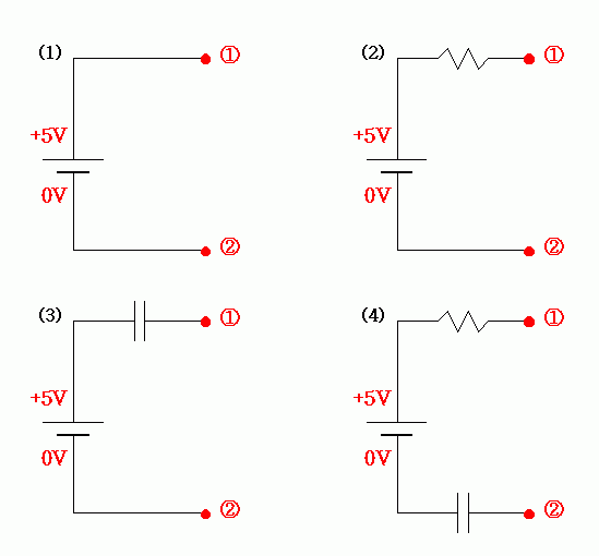 먼저 (1)~(4)의 그림을 보자. 직류 +5 V의 건전지를 이용한 회로인데 양쪽 전극 사이가 끊어져 있다. 각각의 경우에서 ①, ② 지점에서의 전압값은 얼마이겠는가?