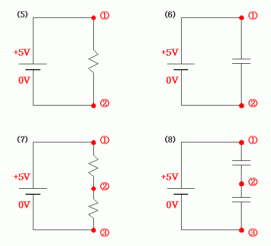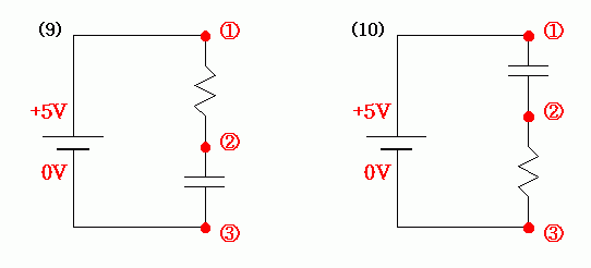 (9)에서 콘덴서는 직류에 대해서 끊어진 상태와 마찬가지이다. 따라서, 위의 (2)번 과 같은 상황이 된다. +5V 전극이 저항까지는 연결되어 있고 콘덴서에서 전선이 끊어져 있으니깐 ① +5V, ② + 5 V 가 되고, 콘덴서 반대편은 0V 전극에 연결되어 있으니깐 ③ 0 V.