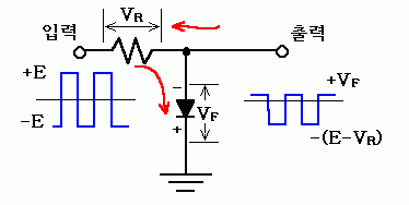 이 회로는 맨 앞에서 말한 다이오우드의 특성만 잘 이해하면 출력신호의 형태를 알아낼 수 있다. (-)신호가 들어올 때는 GND(그라운드)쪽에서 다이오우드가 on 상태가 되어서 전류가 흘러들어간다. 이때, 0 V 쪽은 고정되어 있고(우리가 전압의 기준으로 삼으니깐), 순방향 전압강하가 있으므로 출력신호 측에는 -VF 만큼의 전압이 나타나게 된다.