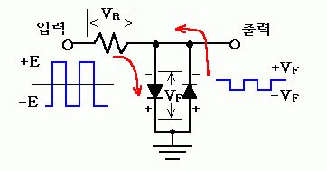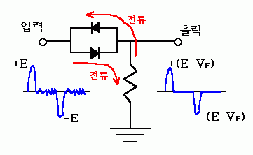 아래 그림과 같이 다이오우드를 입력과 출력 사이에 직렬로 연결한 경우는 많이들 보아서 잘 알고 있을 것이다. +E 에서 -E 까지 전압이 변화하는 입력신호가 들어오는 경우에 다이오우드의 연결 방향에 따라 출력은 (+)쪽의 신호만 통과시키게 된다.