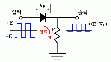 여기서 유의할 점은, 입력신호와 출력신호의 모양은 같지만, 출력신호의 최고 전압이 +E 가 아니라 + (E-VF) 가 된다는 점이다. 눈치 빠른 독자는 이미 알아차렸겠지만, VF는 물론 앞 절에서 말한 "순방향 전압강하" 값이 된다.