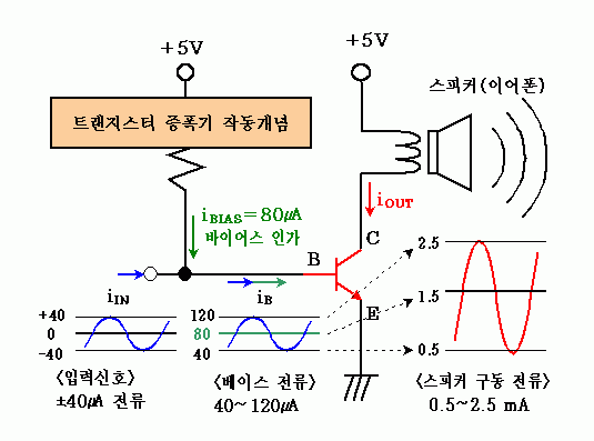작동을 살펴보면, +40~-40 uA의 입력전류에 +80 uA의 바이어스 전류를 인가하여, 변화하는 모양은 간직한 +신호로 바꾸어서 베이스로 들어가게 된다. 그러면, 전체 입력신호의 변화에 대응되는 출력전류의 변화가 나타나게 되며, 그대로 연결하면 들리지 않던 미세한 신호가 증폭되어 스피커를 움직여 귀로 들을 수 있게 되는 것이다.
