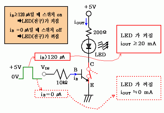 [스위치 on ] +5V가 베이스(B)와 에미터(E) 사이에 걸리게 되면, 베이스로 흘러들어가는 전류가 120 uA(마이크로 암페어)를 넘게 되어 트랜지스터 양단의 저항이 거의 0 Ω이 된다. (=스위치 on 상태가 된다.) 그러면, 약 20 mA 전후의 전류가 전구(발광다이오우드, LED)에 흐르게 되어 불이 켜진다.